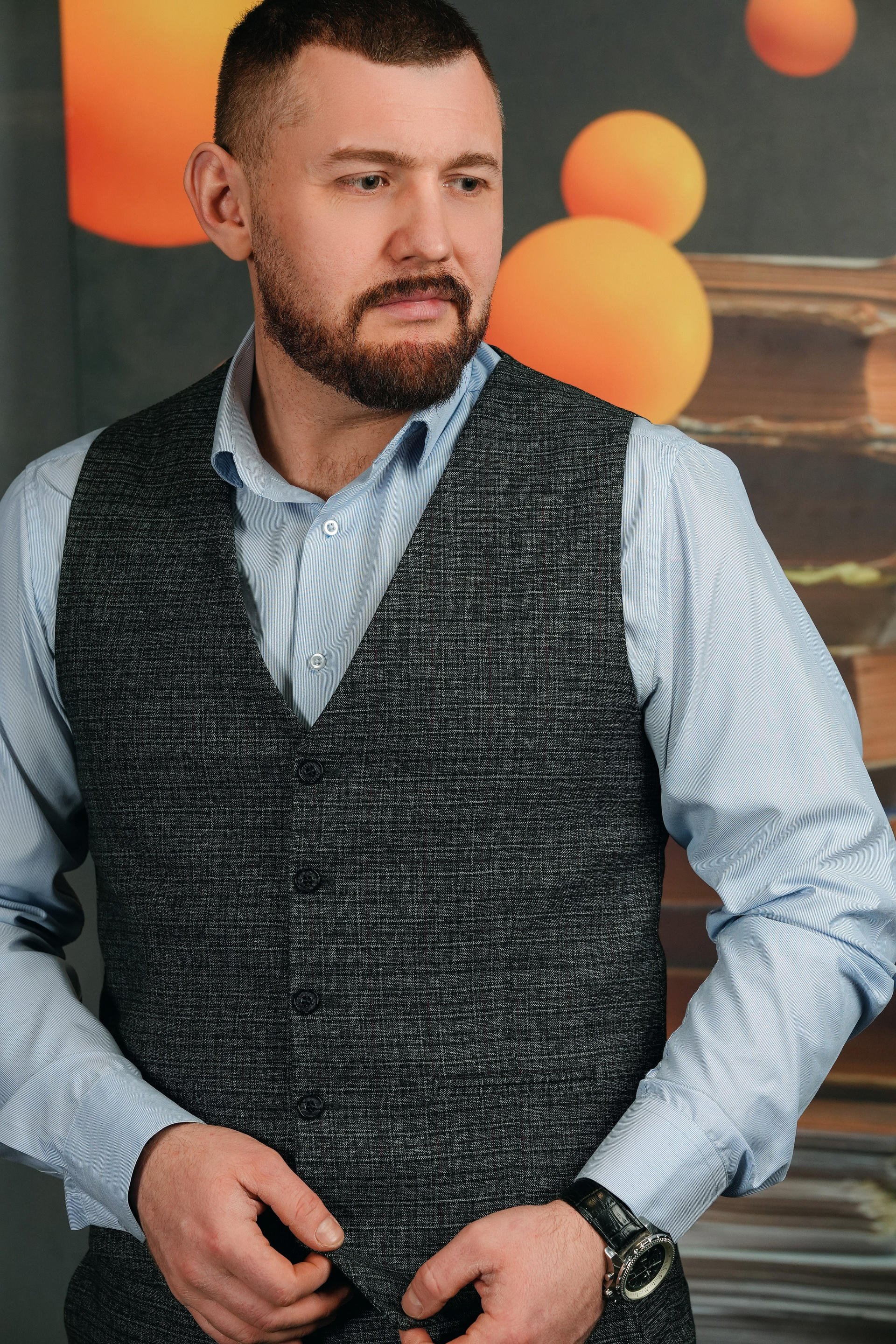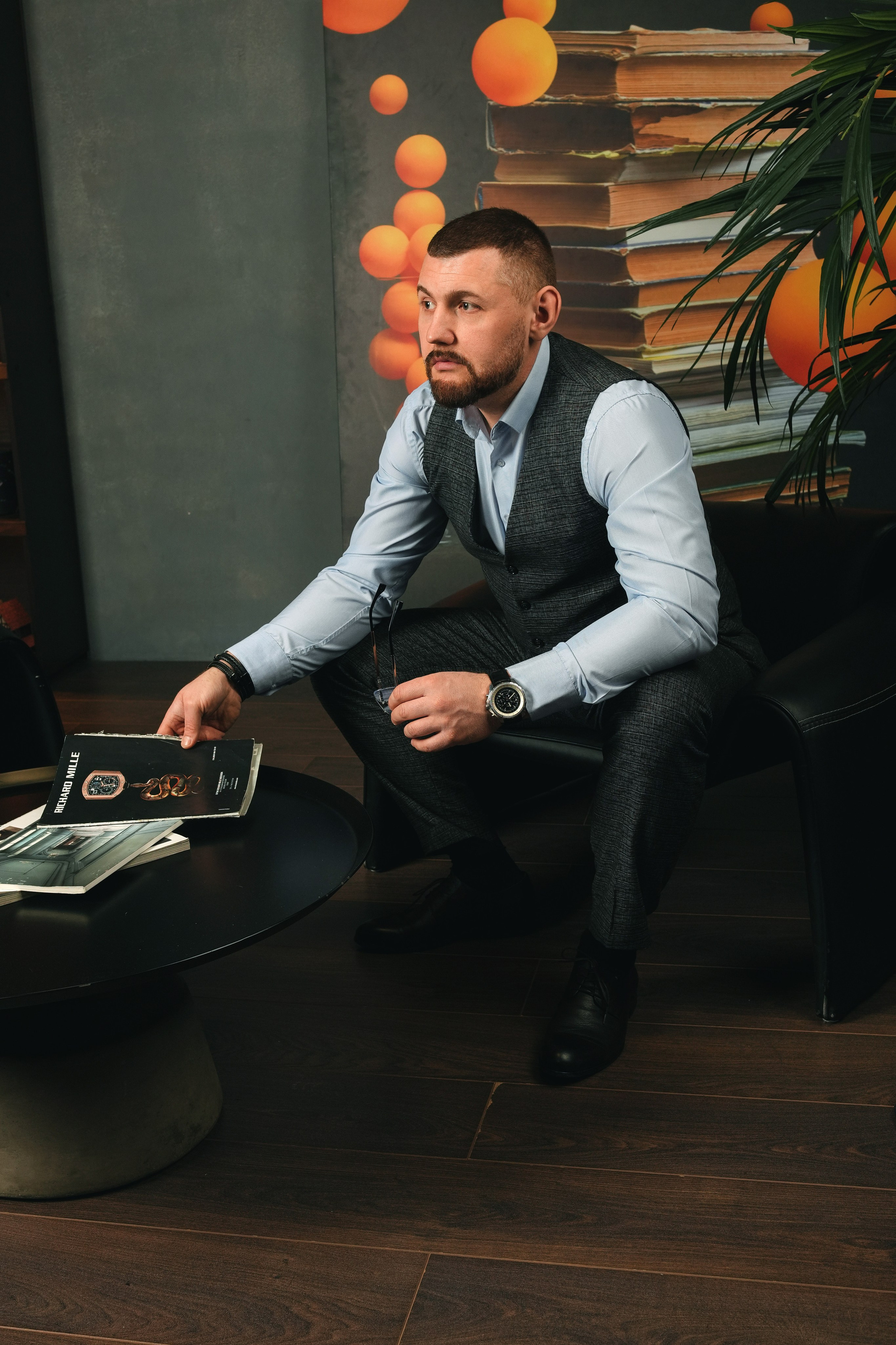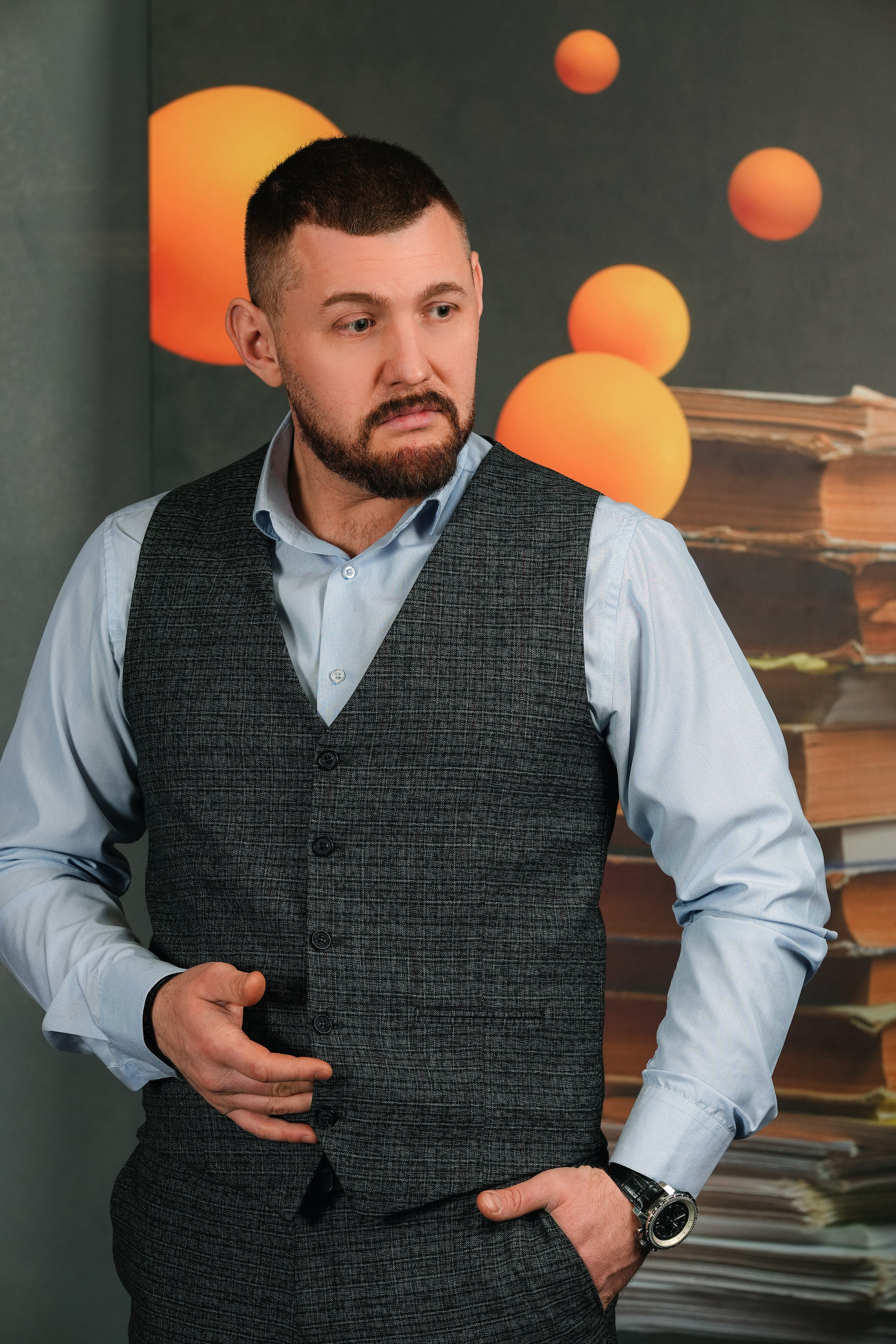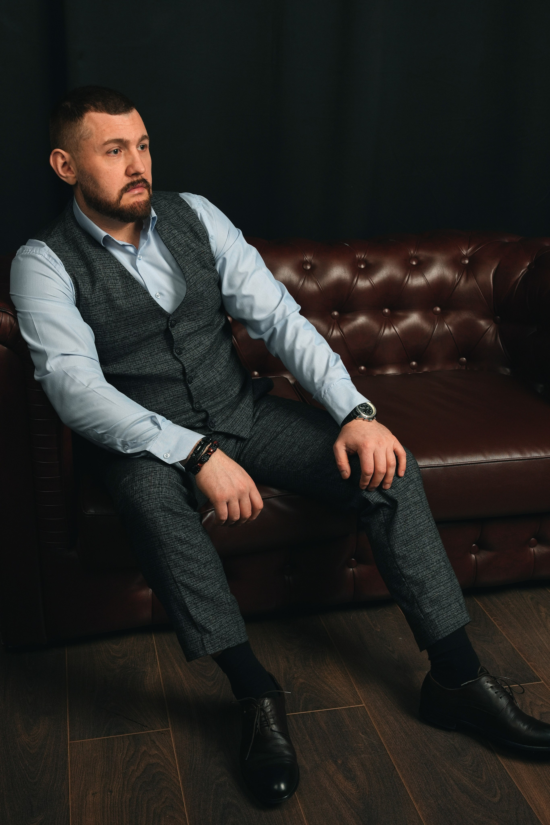 Я создаю комфортную атмосферу и управляю процессом. Мы делаем разные ракурсы: классический портрет у рабочего стола, динамичные кадры в интерьере, уверенные позы на нейтральном фоне. Работаем до получения гарантированного результата.
